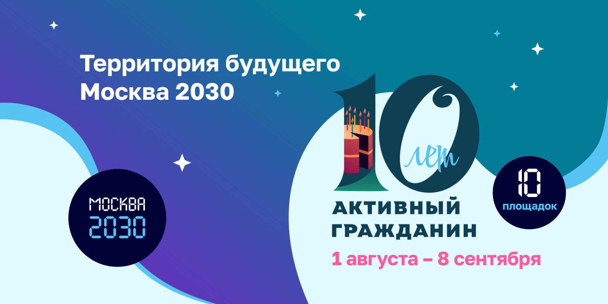 С 1 августа по 8 сентября в рамках форума-фестиваля «Территория будущего. Москва 2030» отметят 10-летие проекты «Активный гражданин» и «Город идей». В 9 парках и на площади Юности в Зеленограде будут работать фестивальные площадки проектов-юбиляров, а также других электронных сервисов Москвы: портала «Наш город», проекта «Город заданий», городской программы лояльности «Миллион призов», платформы «Электронный дом», проектов «Мой id» и «Московские электронные услуги».